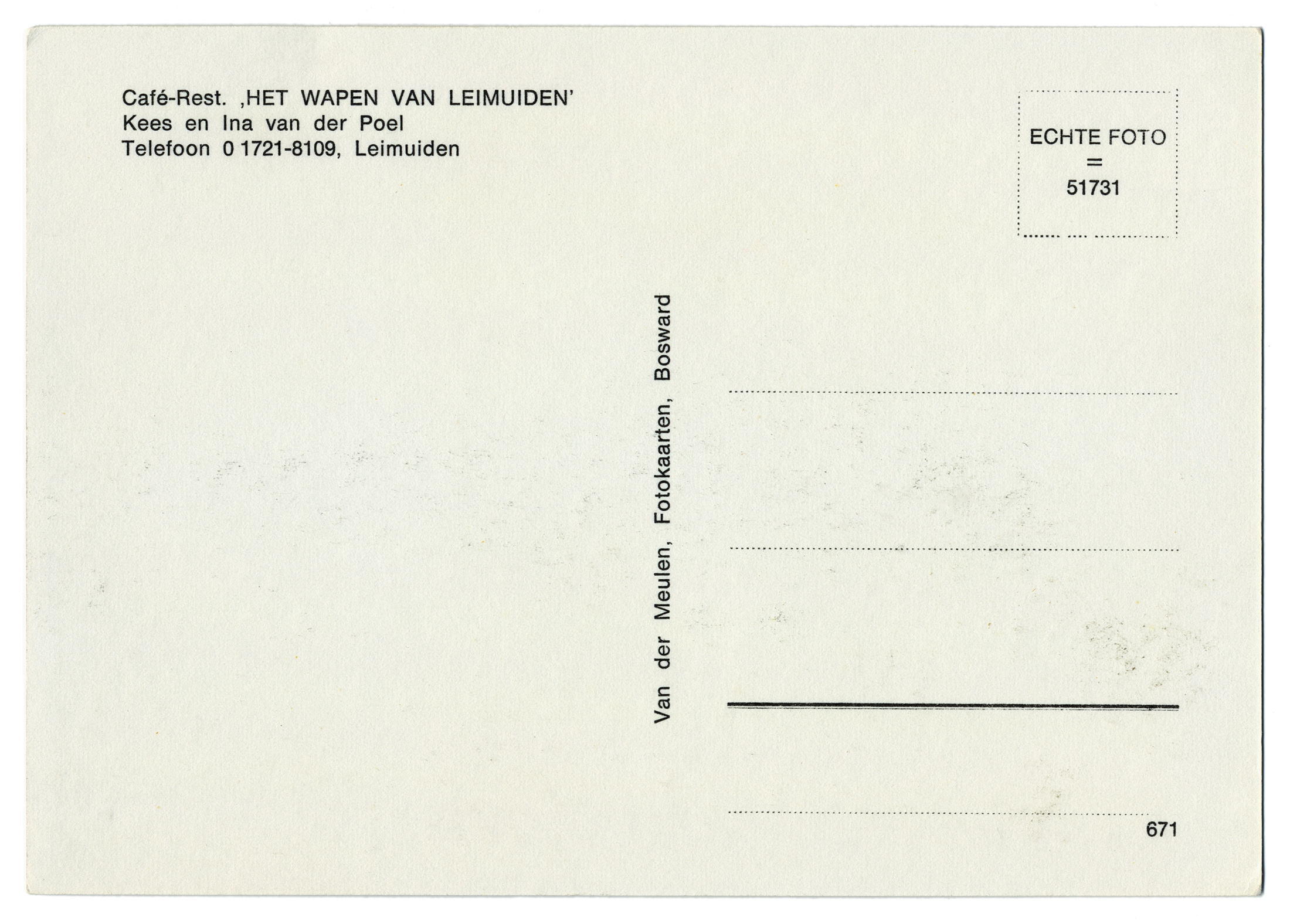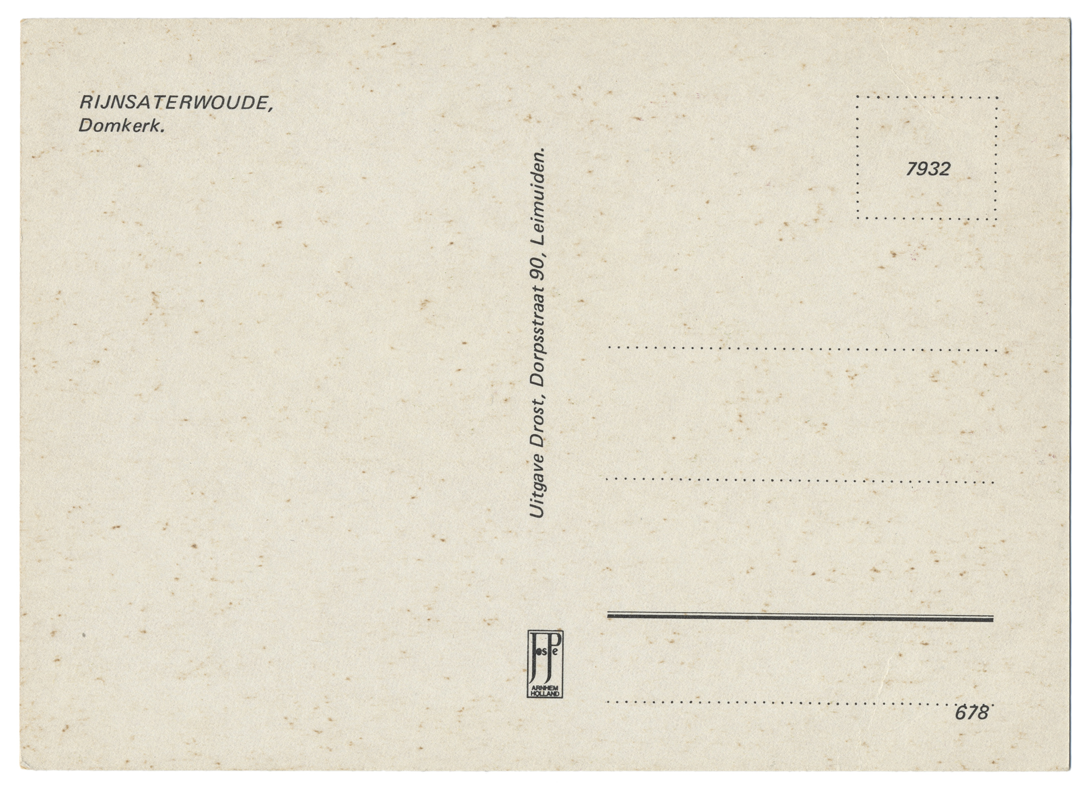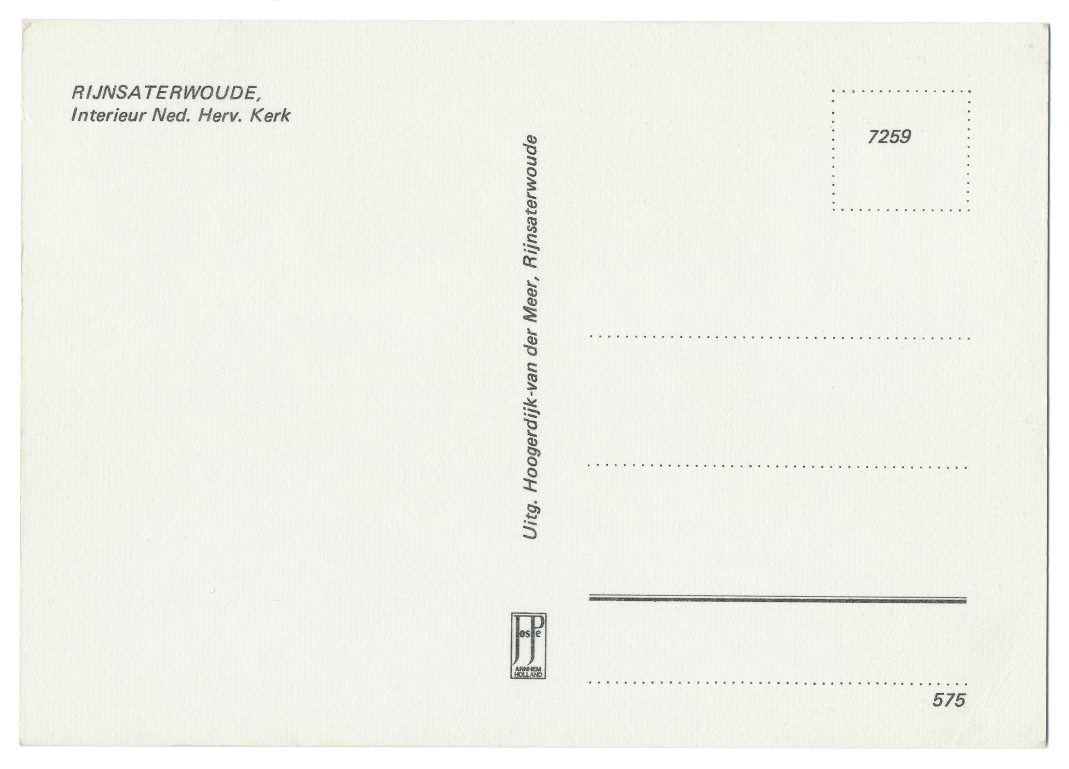 2,92 MB | '''Rijnsaterwoude - Herenweg''' Producent: Jospé Arnhem Uitgave: Fa. Verhagen * Locatie: Herenweg Het fotomateriaal mag niet commercieel worden ingezet. Bij gebruik aub het volgende vermelden: '''''Collectie kleinrondleimuiden.nl | CC BY-NC-ND 4.0''''' | 1 |