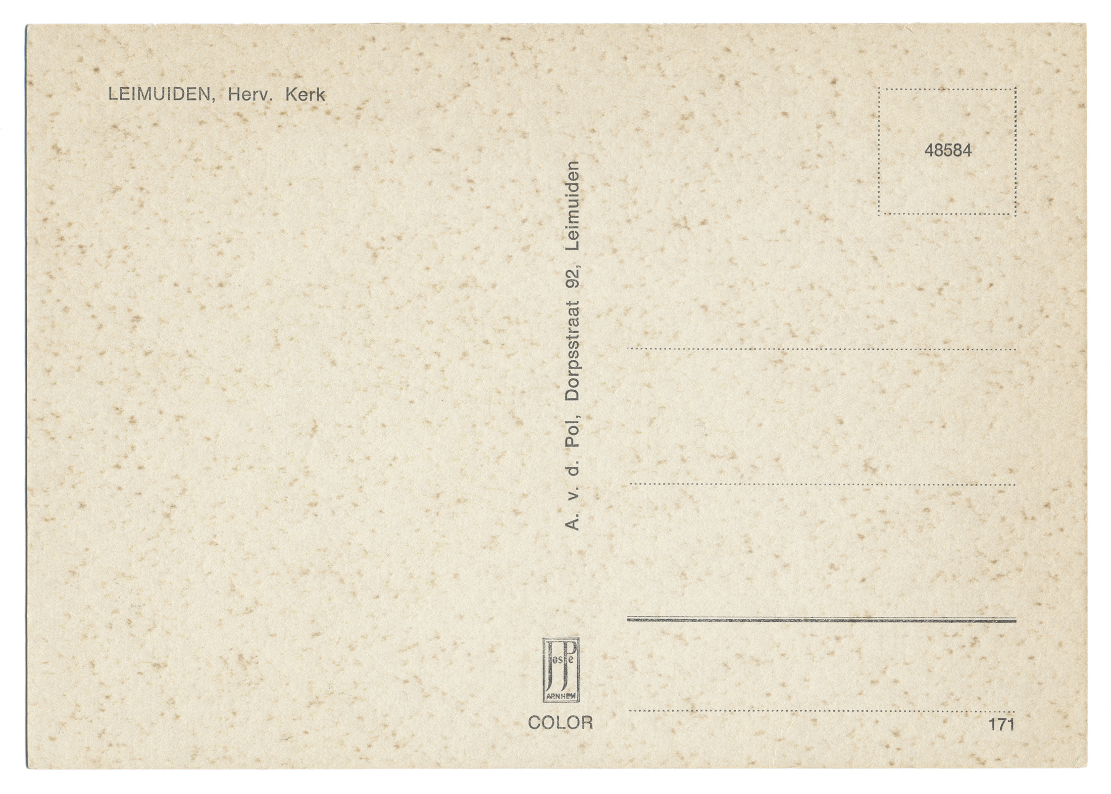 5,9 MB | '''Leimuiden - Herv. Kerk''' Producent: Jospé Arnhem Uitgave: v.d. Pol * Locatie: Dorpskerk Het fotomateriaal mag niet commercieel worden ingezet. Bij gebruik aub het volgende vermelden: '''''Collectie kleinrondleimuiden.nl | CC BY-NC-ND 4.0''''' | 1 |